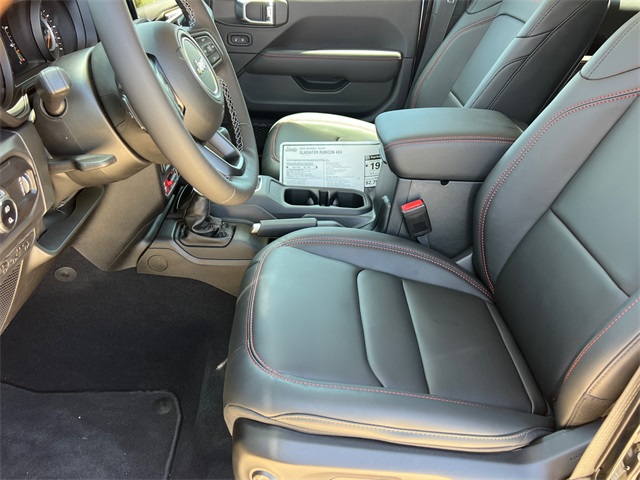 This Gladiator Rubicon comes well equipped with Convenience Group (Heated Front Seats, Heated Steering Wheel, Remote Start System, SiriusXM Radio Service, SiriusXM w/360L, and Universal Garage Door Opener), Quick Order Package 24R Rubicon, Body Color 3-Piece Hard Top, Freedom Panel Storage Bag, GPS Navigation, Rear Sliding Window, Rear Window Defroster, Wheels: 17" x 7.5" Machined/Painted Black, 12.3" Touchscreen Display, 4-Wheel Disc Brakes, 4.10 Rear Axle Ratio, 4G LTE Wi-Fi Hot Spot, 8 Speakers, 97 MPH Vehicle Max Speed Calibration, ABS brakes, Air Conditioning, Alexa Built-In, Alloy wheels, AM/FM radio: SiriusXM, Apple CarPlay, Apple CarPlay/Android Auto, Automatic temperature control, Body Color Rubicon Highline Flare, Brake assist, Cloth Low-Back Bucket Seats, Compass, Connectivity - US/Canada, Delay-off headlights, Driver door bin, Driver vanity mirror, Dual front impact airbags, Dual front side impact airbags, Electronic Stability Control, Emergency communication system: Jeep Connect, Front anti-roll bar, Front Bucket Seats, Front Center Armrest w/Storage, Front dual zone A/C, Front fog lights, Front License Plate Bracket, Front reading lights, Fully automatic headlights, Google Android Auto, Heated door mirrors, Illuminated entry, Integrated roll-over protection, Low tire pressure warning, MOPAR Spray In Bedliner, Occupant sensing airbag, Outside temperature display, Overhead airbag, Panic alarm, Passenger door bin, Passenger vanity mirror, Performance Suspension, Power door mirrors, Power steering, Power windows, Radio data system, Radio: Uconnect 5 w/12.3" Display, Rear anti-roll bar, Rear reading lights, Remote keyless entry, Security system, Speed control, Split folding rear seat, Steering wheel mounted audio controls, Tachometer, Telescoping steering wheel, Tilt steering wheel, Traction control, Trip computer, USB Host Flip, Variably intermittent wipers, and Voltmeter.