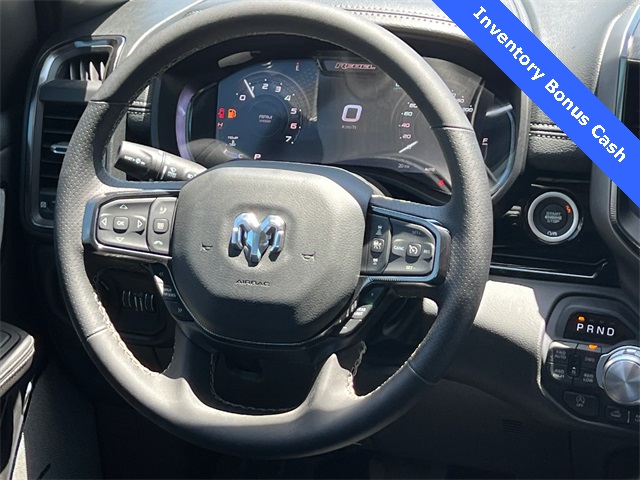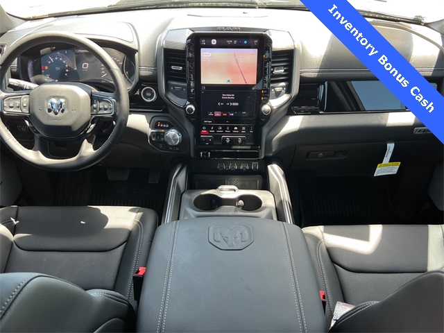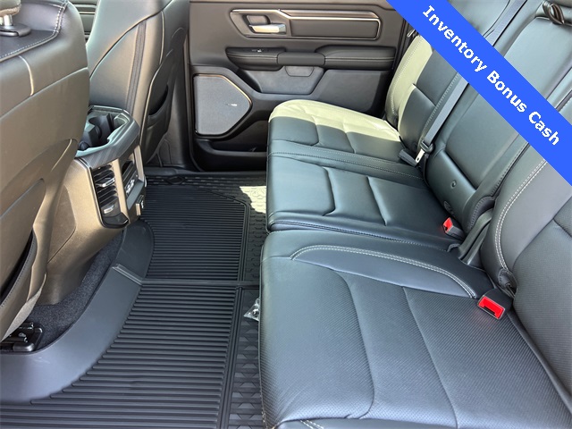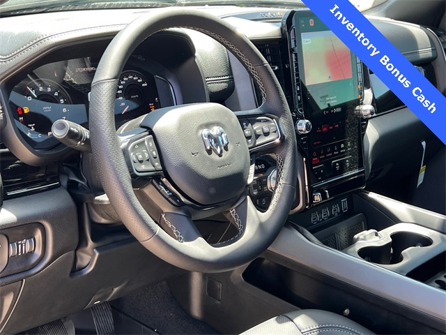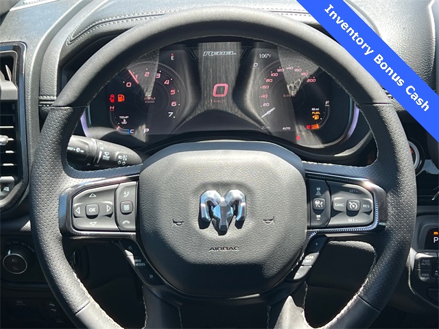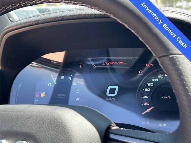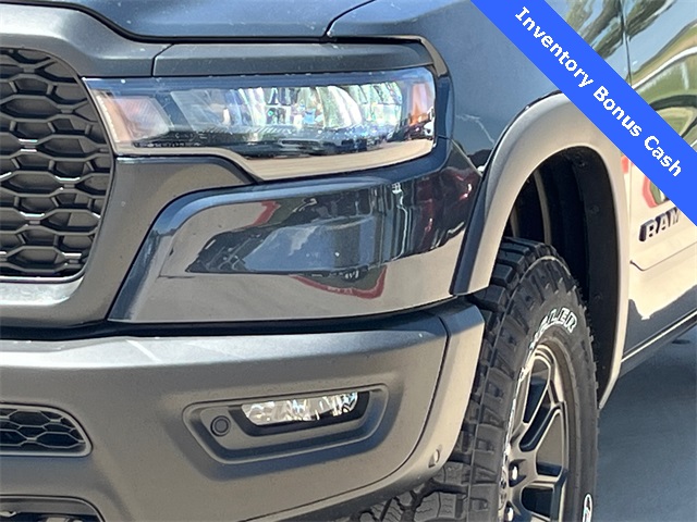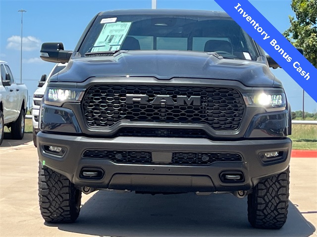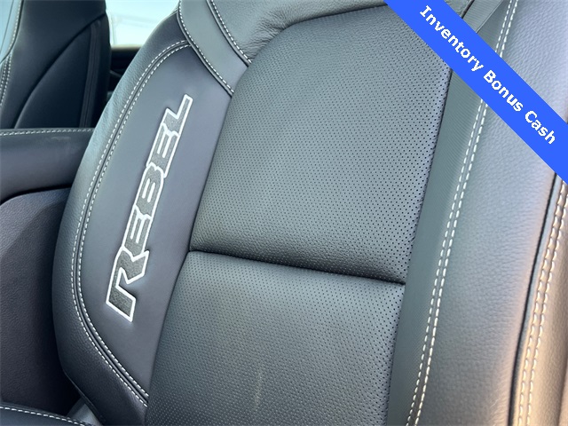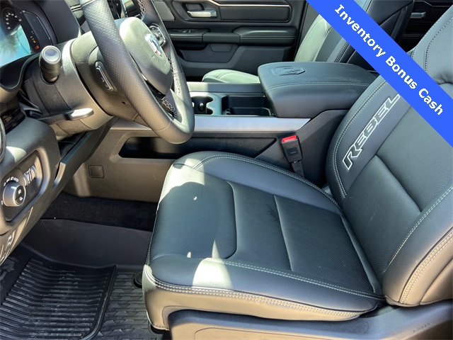 This 1500 Rebel comes well equipped with Bed Utility Group (Exterior 115V AC Outlet and MOPAR 4 Adjustable Cargo Tie-Down Hooks), Quick Order Package 21W Rebel, Rebel Level 2 Equipment Group (115V Auxiliary Rear Power Outlet, 14.4" Touchscreen Display, 2-Door Passive Entry, Front Door Locks, 4G LTE Wi-Fi Hot Spot, Accent Color Door Handles, Accent Color Premium Power Mirrors, Accent Color Tailgate Handle, Apple CarPlay, Auto Power-Folding Mirrors, Auto-Dimming Exterior Driver Mirror, Black Painted Exterior Mirrors Caps, Connectivity - US/Canada, Convex Wide-Angle Exterior Mirror Insert, Disassociated Touchscreen Display, Driver Seat Memory, Dual Wireless Charging Pad, Exterior Mirrors Approach Lamps, Exterior Mirrors Courtesy Lamps, Front Passenger Interactive Display, Google Android Auto, GPS Antenna Input, GPS Navigation, HD Radio, Heated Second Row Seats, Integrated Center Stack Radio, Off-Road Information Pages, Power 2-Way Passenger Lumbar Adjust, Power Adjust 8-Way Front Passenger Seat, Power Tailgate, Proximity Approach/Departure Lamps, Radio/Driver Seat/Mirrors/Pedals Memory, Rain Sensitive Windshield Wipers, Rear Window Defroster, Security Alarm, SiriusXM Radio Service, and USB Host Flip), 1500 Rebel, 4D Crew Cab, 3.0L I6, 8-Speed Automatic, 4WD, Forged Blue Metallic, Black Leather, Wheels: 18" x 8.0" Painted Mid-Gloss Black, 10 Speakers, 3.92 Rear Axle Ratio, 33 Gallon Fuel Tank, 4 Way Front Headrests, 4-Wheel Disc Brakes, ABS brakes, Air Conditioning, Alloy wheels, AM/FM radio: SiriusXM with 360L, Apple CarPlay/Android Auto, Auto High-beam Headlights, Auto-dimming Rear-View mirror, Automatic temperature control, Black Exterior Mirrors, Brake assist, Bucket Seats, Cloth/Vinyl Bucket Seats, Compass, Delay-off headlights, Dome Dual LED Reading Lamp, Driver door bin, Driver vanity mirror, Dual front impact airbags, Dual front side impact airbags, Dual-Pane Panoramic Sunroof, Electronic Stability Control, Front anti-roll bar, Front Bucket Seats, Front Center Armrest w/Storage, Front dual zone A/C, Front fog lights, Front License Plate Bracket, Front reading lights, Front Seat Back Map Pockets, Front wheel independent suspension, Full Length Upgraded Floor Console, Fully automatic headlights, Garage door transmitter, Heated door mirrors, Heated Front Seats, Heated front seats, He Price includes: $2000 - 2026 National Select Inventory Bonus Cash. Exp. 02/02/2026 $3500 - 2026 National Retail Consumer